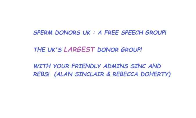 This is the largest UK donor group. It's here to connect women who need help to get pregnant with men who can help them. It's a free speech group, so you can post whatever you like, but it's obviously advisable to be as specific as possible about what you're looking for as a recipient, or offering as a donor. Give a rough location, say how far you're willing to travel, and specify what you have in mind.